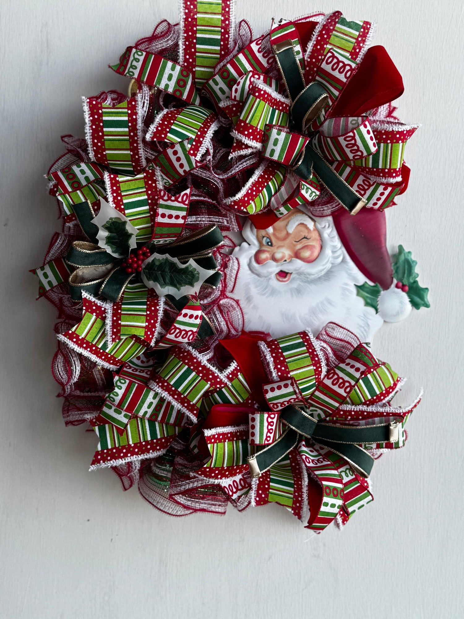 Vintage Santa Christmas Wreath with D’Lux Santa Face Ribbon and Red/Green Farrisilk Ribbon