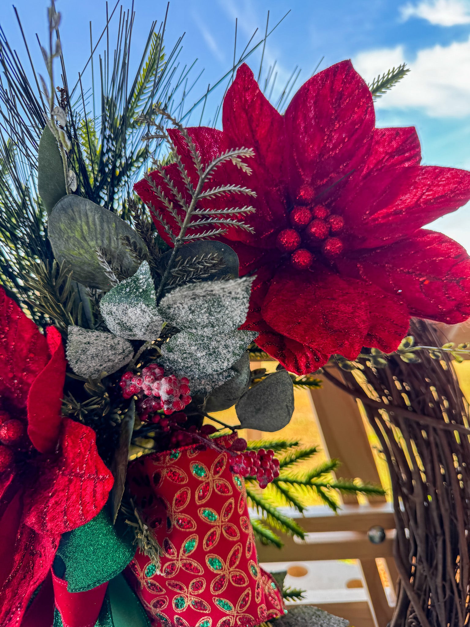 ๐น Features large red velvet poinsettias with jeweled centers
