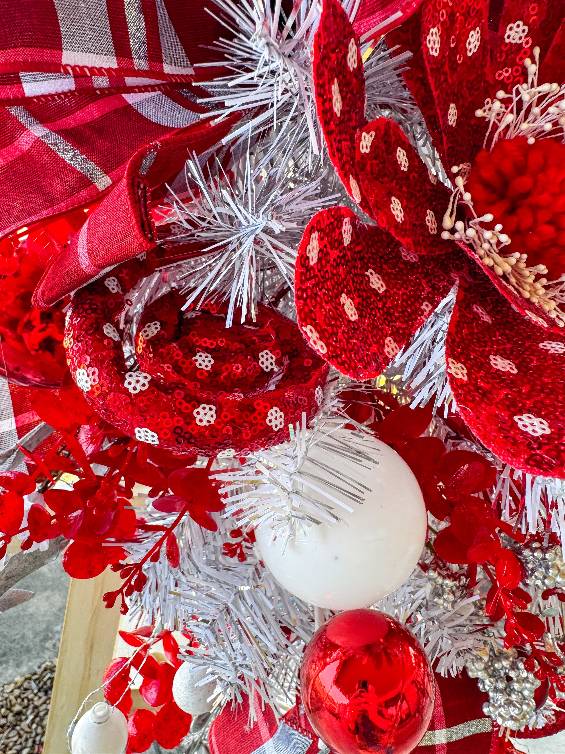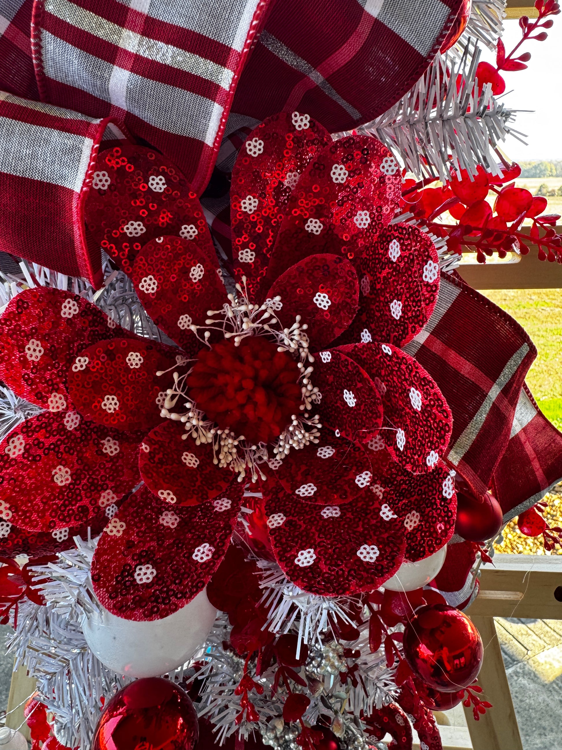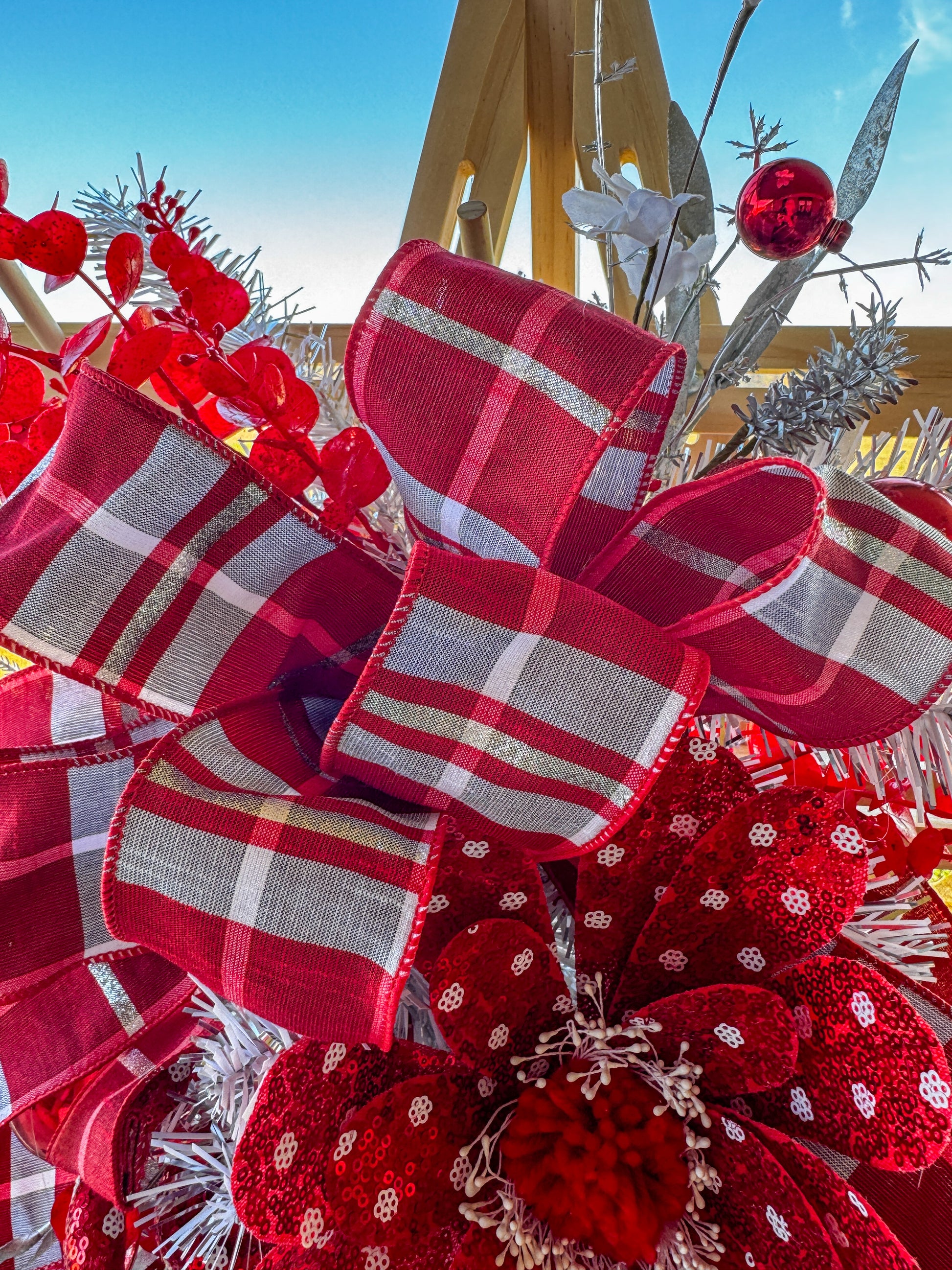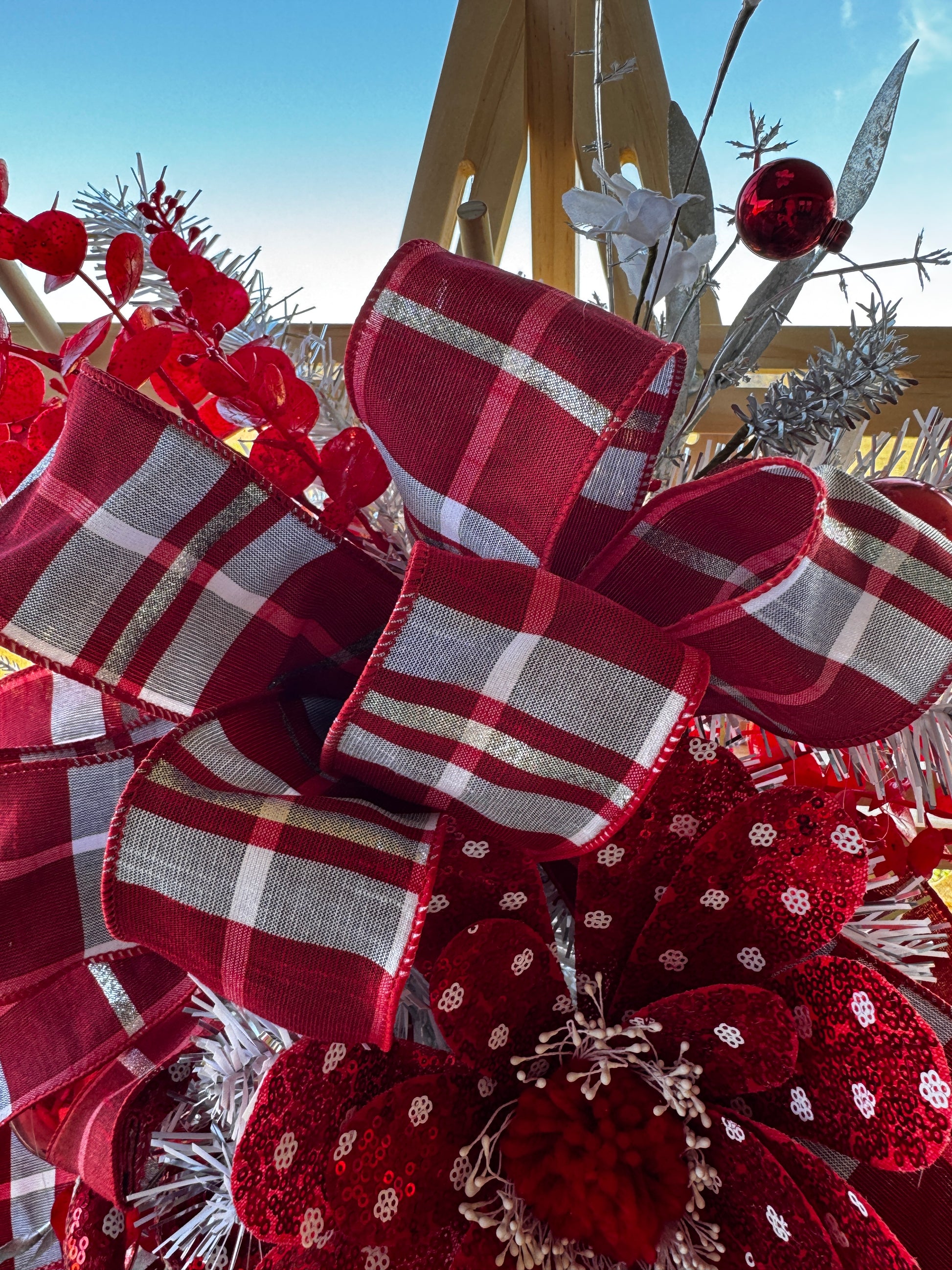 This handcrafted teardrop swag bursts with vibrant red and white elegance, featuring layered plaid and polka dot bows, sparkling silver tinsel stems, red berry sprays, and glossy ornament accents. The rich, wired designer ribbons hold their shape beautifully year after year, while the frosted greenery and metallic accents reflect the magic of the season.