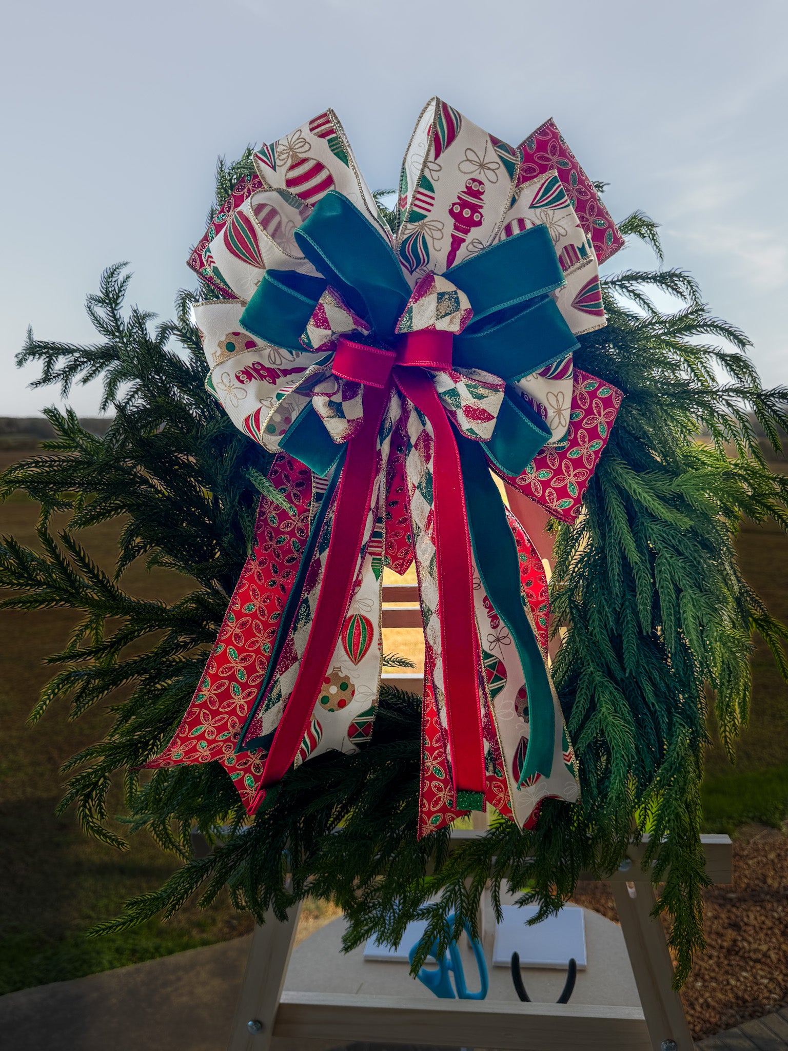 This stunning luxury wreath combines real touch Norfolk pine with the unmatched elegance of Farrisilk designer ribbon. The lush, heavy greenery drapes beautifully, creating a graceful silhouette that highlights the rich velvet and patterned ribbon layers. Deep green velvet, harlequin red-and-white diamond, and metallic accents come together for a look that’s both traditional and refined.