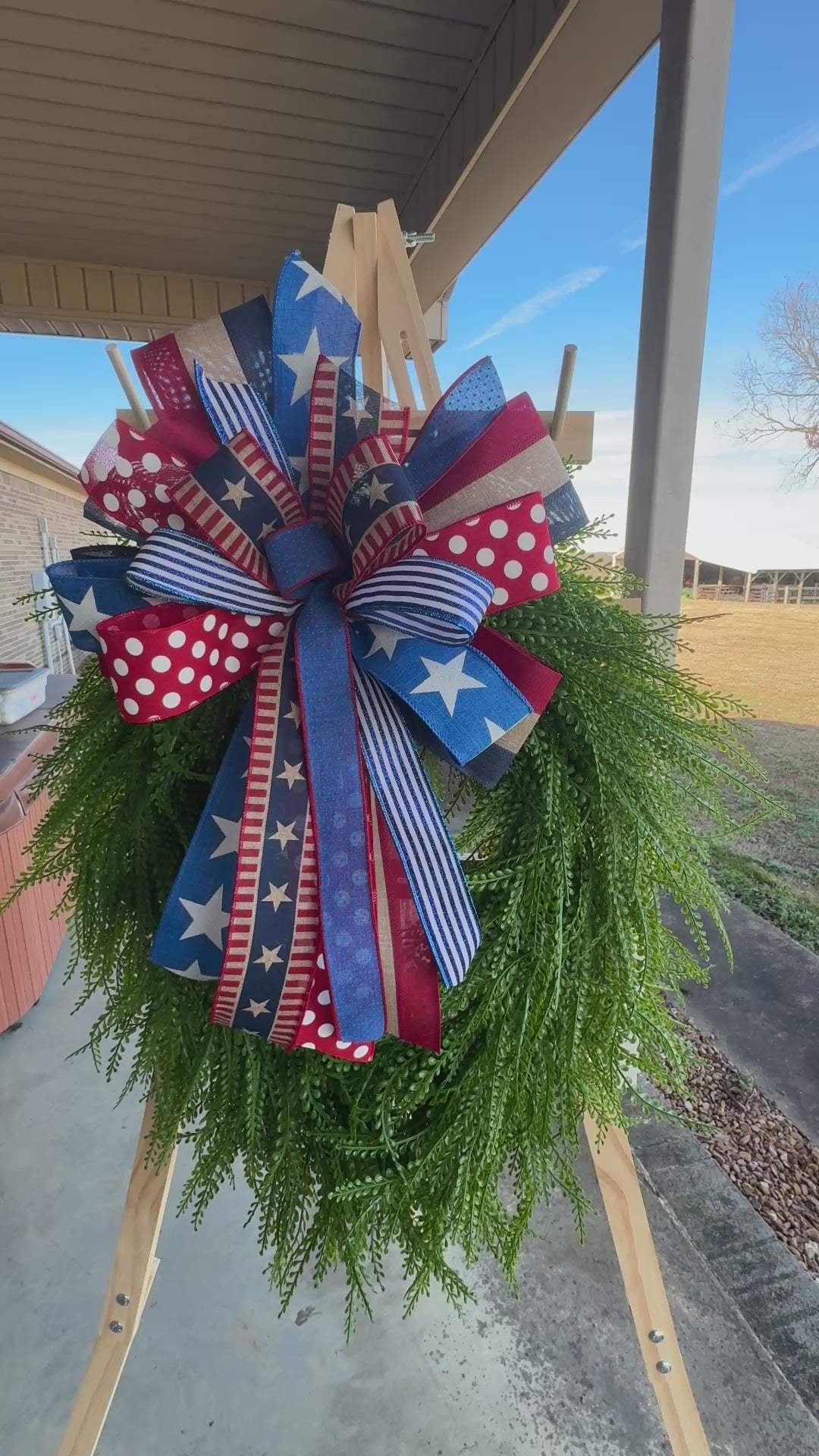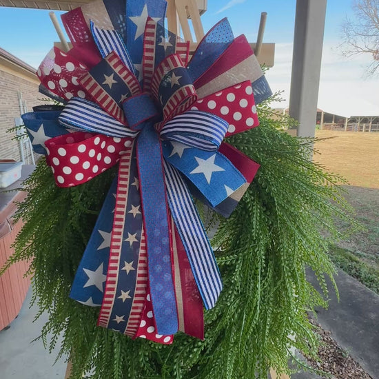 This handcrafted Patriotic Americana bow is designed to make a bold, classic statement on your front door. Featuring a curated mix of premium wired ribbons in rich navy, true red, and soft neutral tones, this bow showcases timeless stars, stripes, and playful polka dots for a layered, high-end look.
