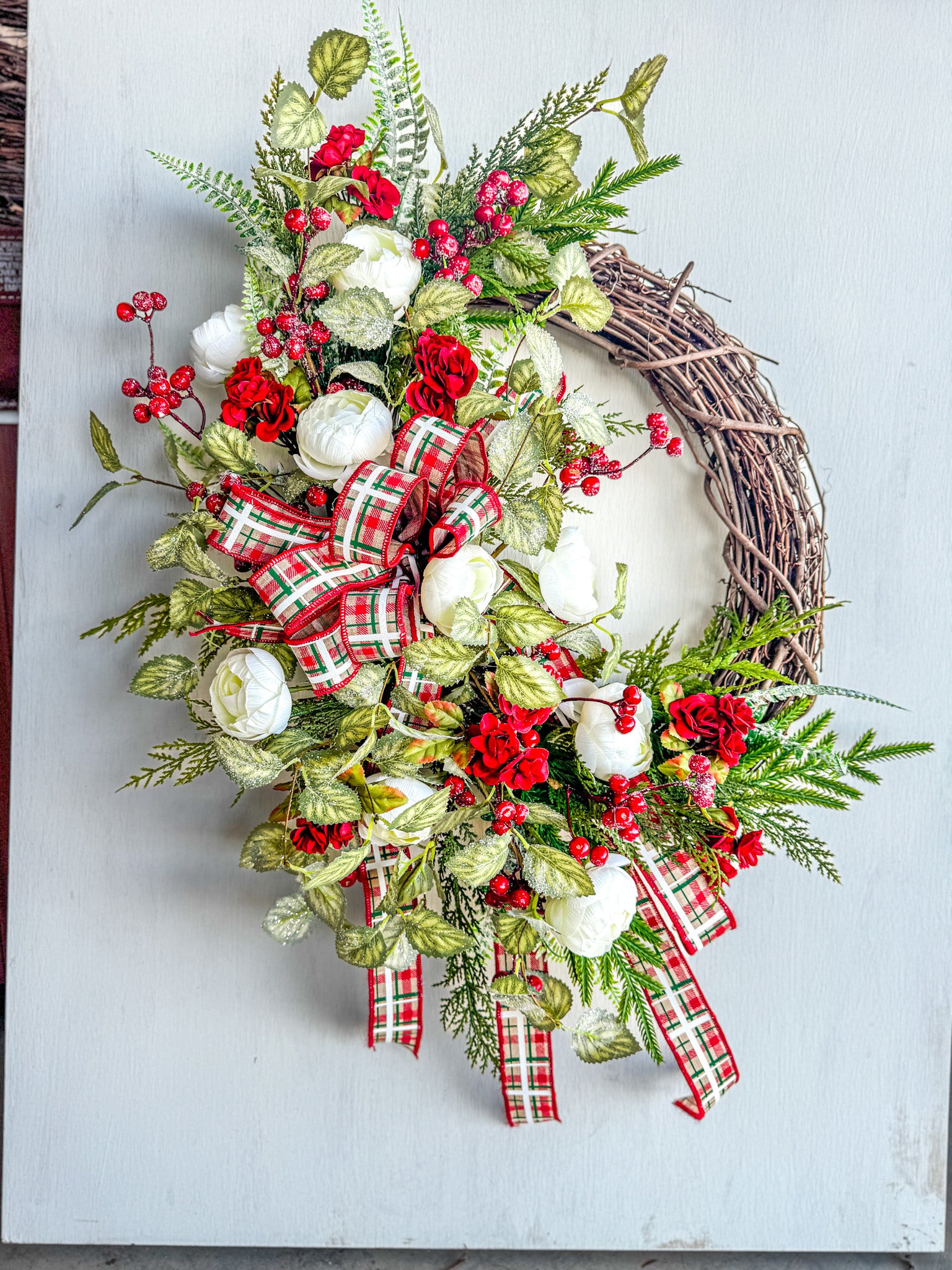 Traditional Christmas Grapevine Wreath with Red Roses, Plaid Ribbon & Cream Florals