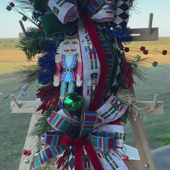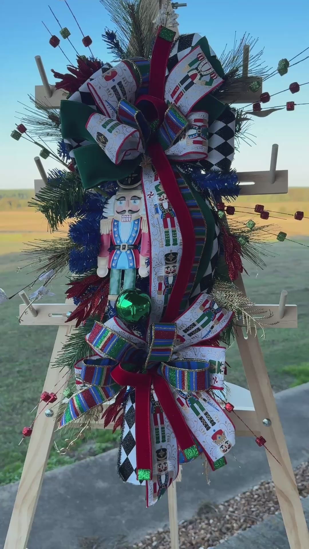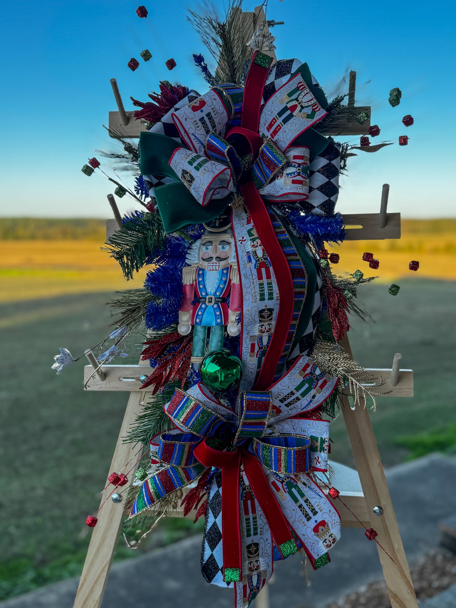 π Nutcracker Teardrop Swag : A statement piece of Christmas elegance β this handcrafted Nutcracker swag blends classic charm with rich emerald velvet, harlequin ribbons, and glittering holiday details.