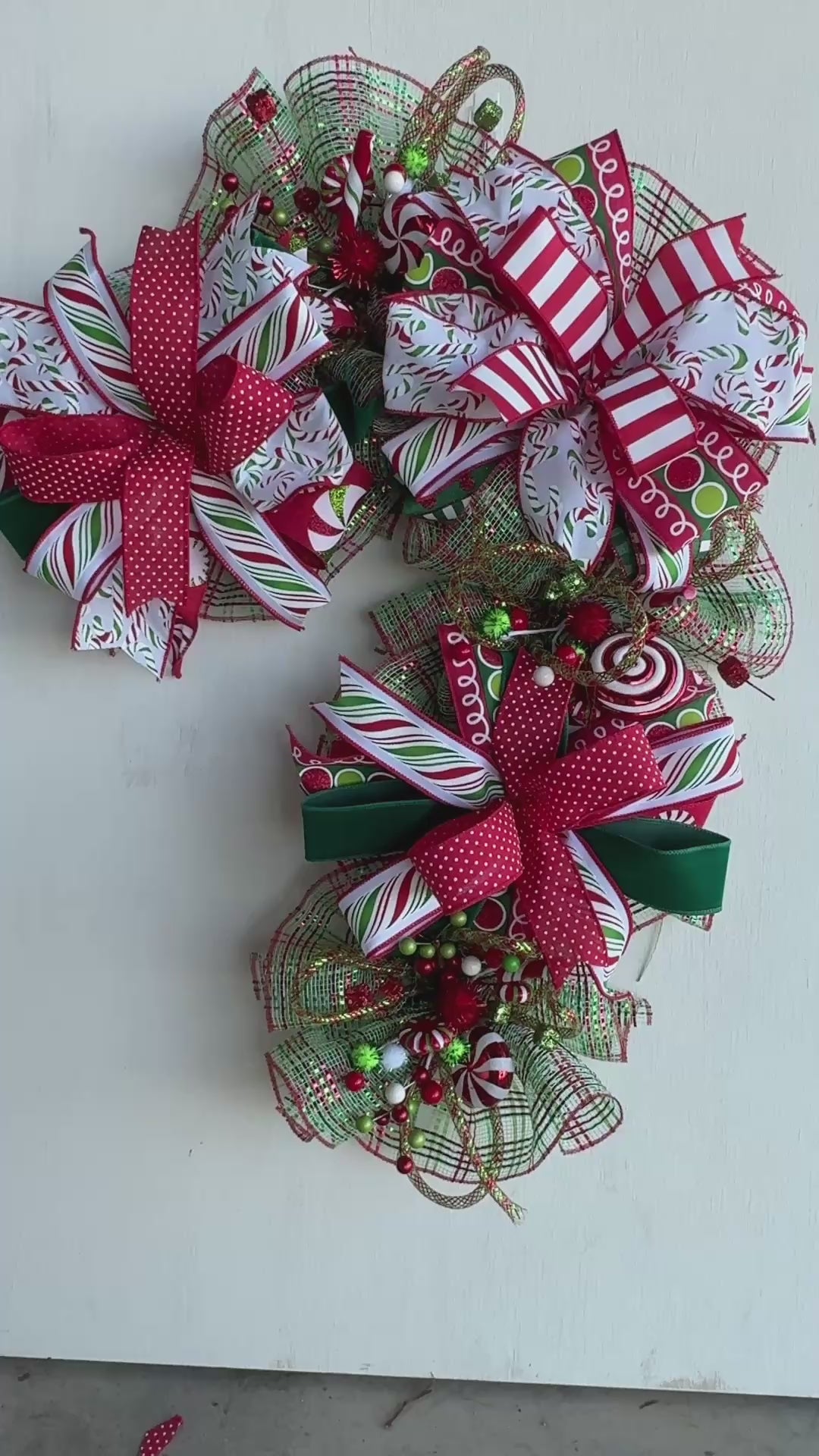 Whimsical handcrafted Candy Cane Swag with striped ribbon, glitter curls, and festive holiday accents. Playful, faith-inspired Christmas décor by Davis Wreath Creations.